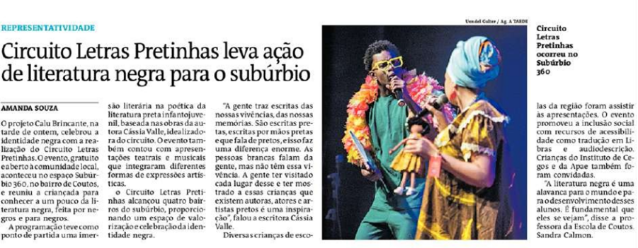 O espetáculo mistura contação, canto, dança e lirismo, criando uma experiência que faz as crianças se reconhecerem, se verem e se sentirem potentes. É celebração, é identidade, é beleza. Não por acaso, levou o Prêmio Braskem de Melhor Espetáculo Infantil, marcando seu lugar como um dos trabalhos mais importantes da cena infantojuvenil baiana.